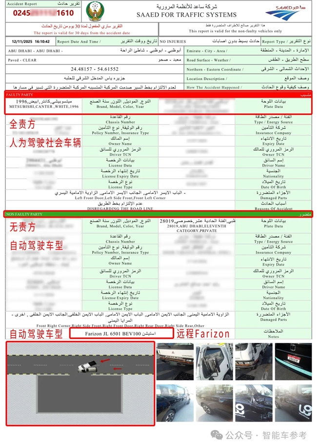 随后,阿布扎比执法部门迅速介入调查,最终出具的结论清晰明确:无人车全程合规无过错,社会车辆承担全部责任,各方均无异议。