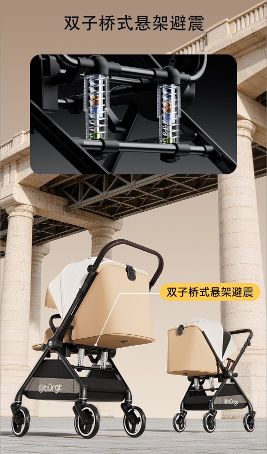 避震从来都是婴儿推车领域的核心技术,目前全球婴儿推车领域已经从纯弹簧缓震,过渡到液压避震,小小的婴儿推车也被汽车行业避震技术赋能,让宝宝们能有乘坐高端汽车的舒适体验。据了解,苏州布格特从2023年开始研发液压避震婴儿推车,至今已经陆续推出多款避震婴儿推车产品,从多连杆悬挂避震系统,到云弧双避震护婴系统,其产品研发的核心理念一直围绕宝宝的乘坐安全需求,结合妈妈的使用便捷需求,真正做到从“被动应对颠簸”转向“主动守护新生”,从“单一功能”转向“系统解决”,从“成人视角”转向“新生需求”。